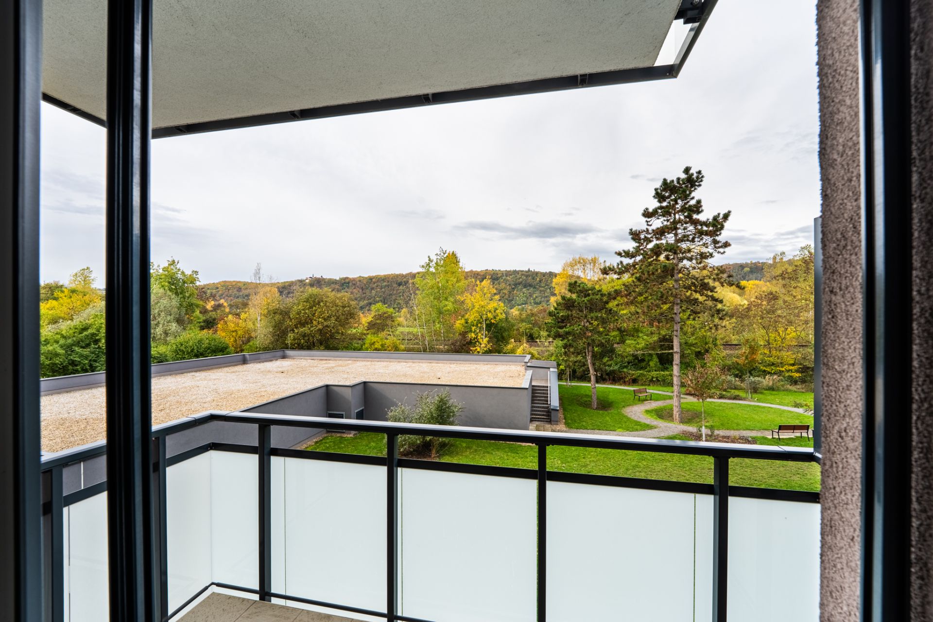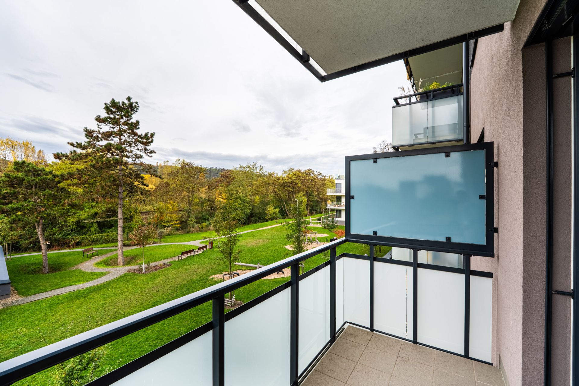 Dominantou bytu je vzdušný obytný prostor, s kuchyňským koutem a praktickým jídelním pultem, který plynule navazuje na velký balkon (8,3 m²) orientovaný na jih. Ráno si tady můžete dát šálek kávy, večer sklenku vína… a během dne si jen tak užívat světlo, klid a výhled do zeleně.