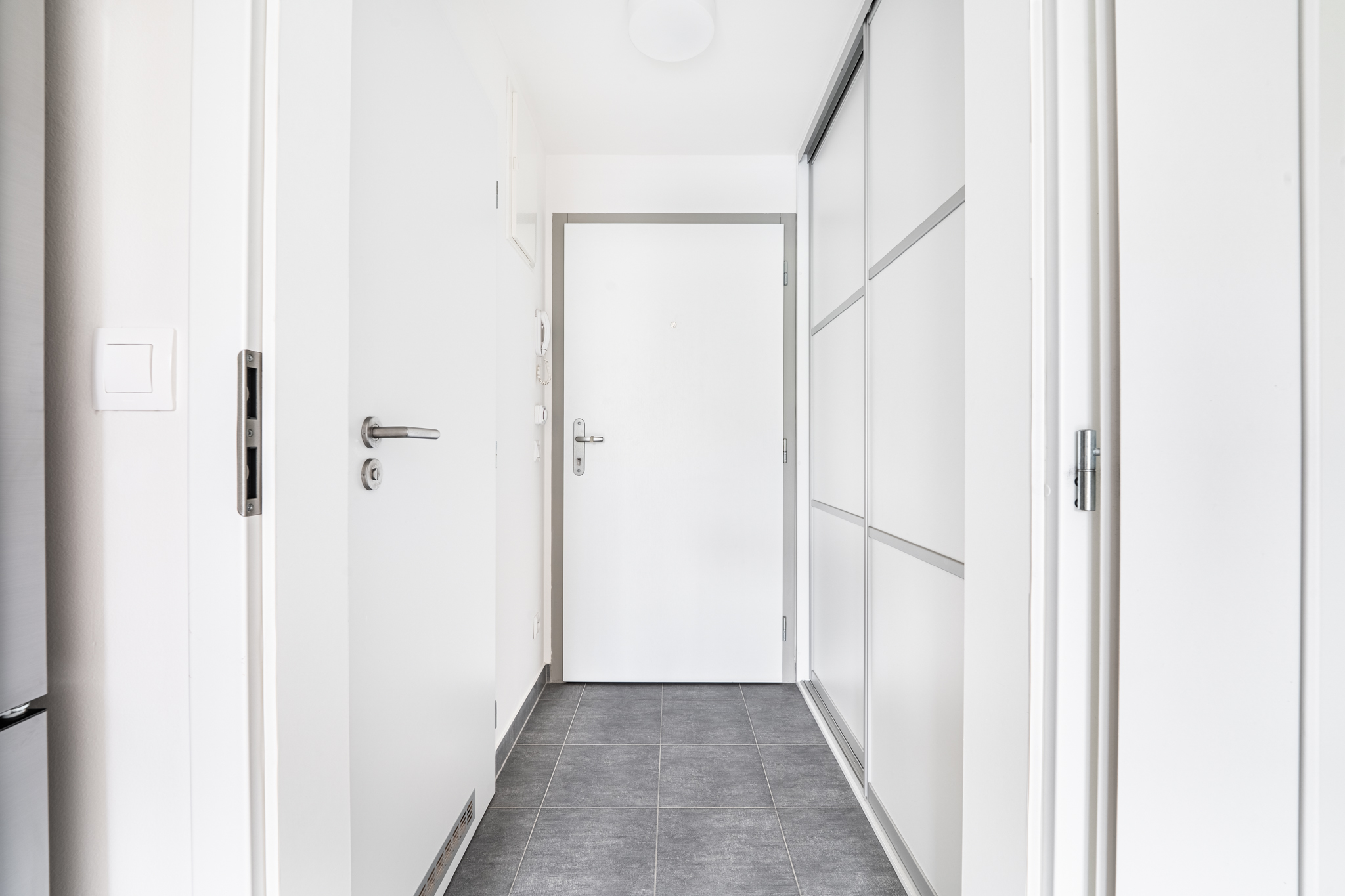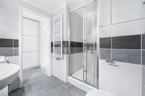 Byt je částečně zařízený, připravený k okamžitému nastěhování nebo k dlouhodobému pronájmu. V předsíni najdete vestavěnou skříň, která šetří prostor a zároveň pojme vše důležité. Koupelna potěší nejen sprchovým koutem, ale i pračkou s přípravou na sušičku a chytrým úložným řešením.