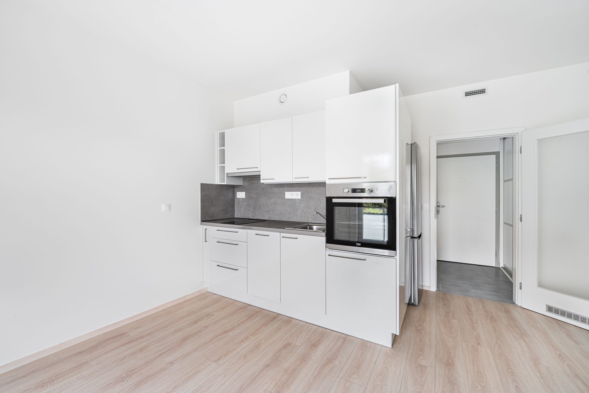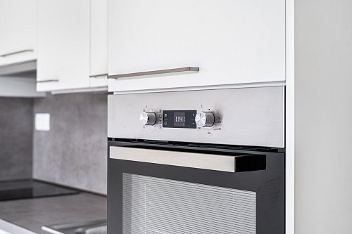 Kuchyňská linka je plně vybavená – od sklokeramické varné desky přes horkovzdušnou troubu, vestavěnou myčku až po lednici s mrazákem, mikrovlnku a digestoř. Vše v moderním stylu. Ať už vaříte každý den, nebo jen občas, budete se tu cítit dobře.